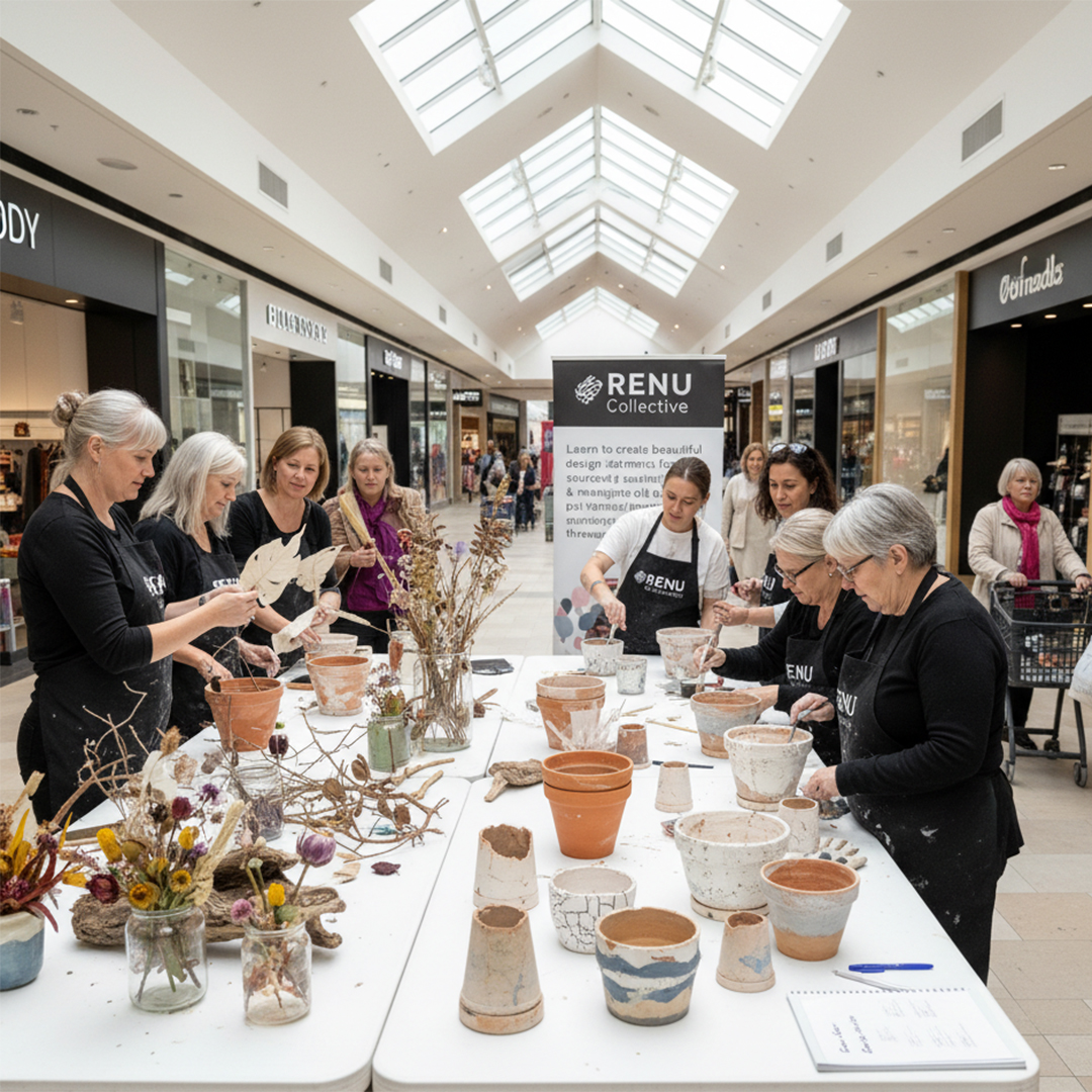 Community engagement combining integrated workshops teaching conscious design principles, display installations throughout your property, and educational signage connecting to circular economy. Perfect for shopping centres, developments, and community spaces.